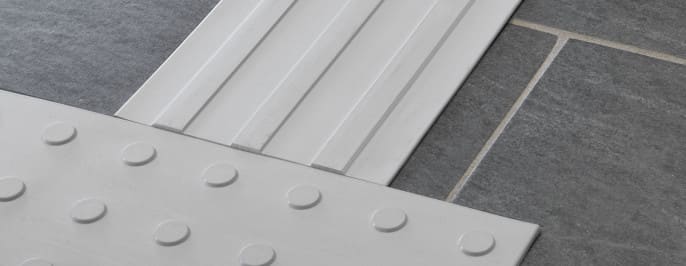 Närbild på varningsplatta och ledstråk av ljusgrått gummi.